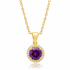 A refined sterling silver necklace featuring a vibrant purple crystal framed by a delicate halo of sparkling zirconia.